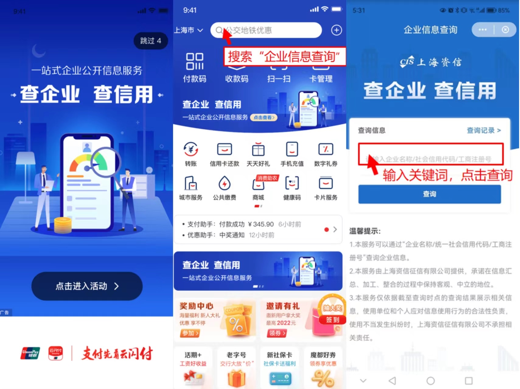 “云闪付”APP用户可通过“企业信息”“企业查询”“企业信息查询”关键词搜索进入小程序,通过“企业名称/统一社会信用代码/工商注册号”实时查询企业公开信息,为广大用户提供一站式企业公开信息查询,帮助用户快捷掌握企业信用状况。