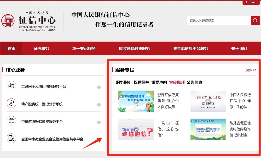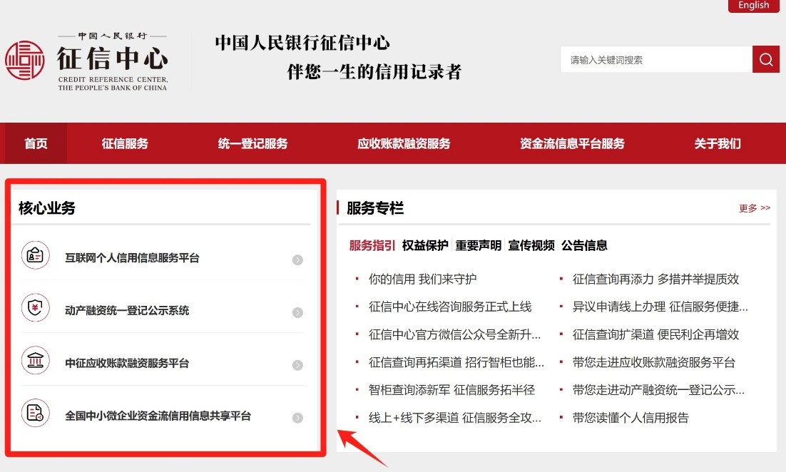 征信中心的核心业务(互联网个人信用信息服务平台、动产融资统一登记公示系统、中征应收账款融资服务平台和全国中小微企业资金流信用信息共享平台)登录入口位于门户网站的醒目位置,便利社会公众一键直达相关业务平台,获取所需服务。